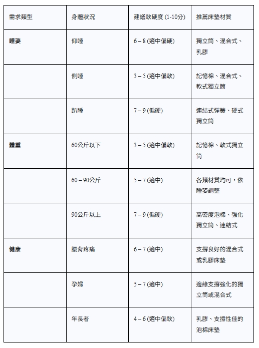 為了方便您快速查找,我們將上述資訊整合為一份「個人化床墊選擇矩陣」: